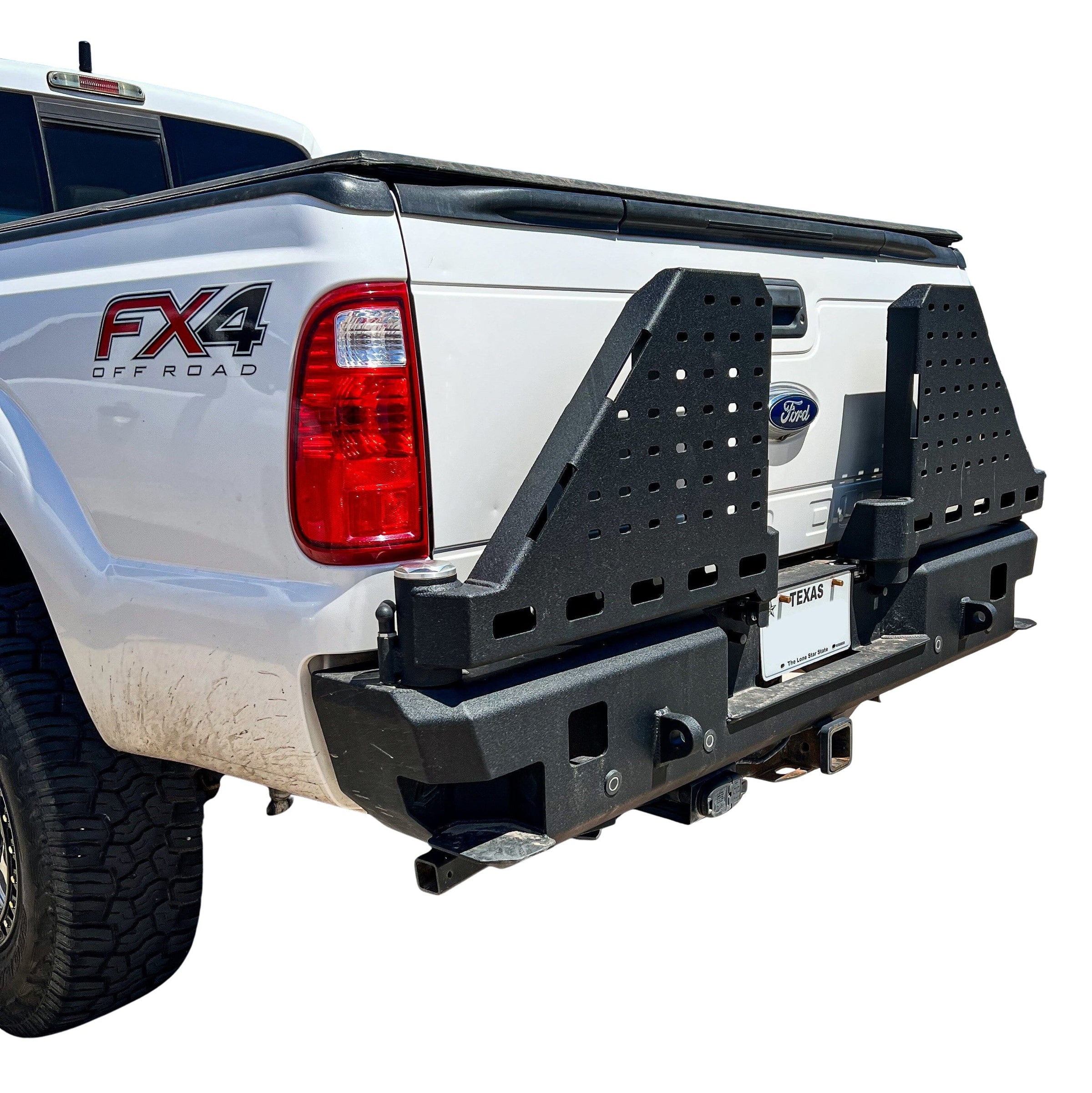 The Octane series dual swing-out bumper is our premium rear tire carrier bumper. Double latching swingout with slam bumpers allow a vibration-free swing out and an easy open/close using our push-button latch system. A secondary latch on the swing-out spindle also allows locking in 2 positions- closed and open, so you don’t need to worry about holding your swing-outs open while lowering your tailgate. Universal ½” Slots on both swingouts allow you to mount up to a 40” Spare tire/wheel, and all your favorite accessories. One spare tire mount is included with the purchase of the bumper.